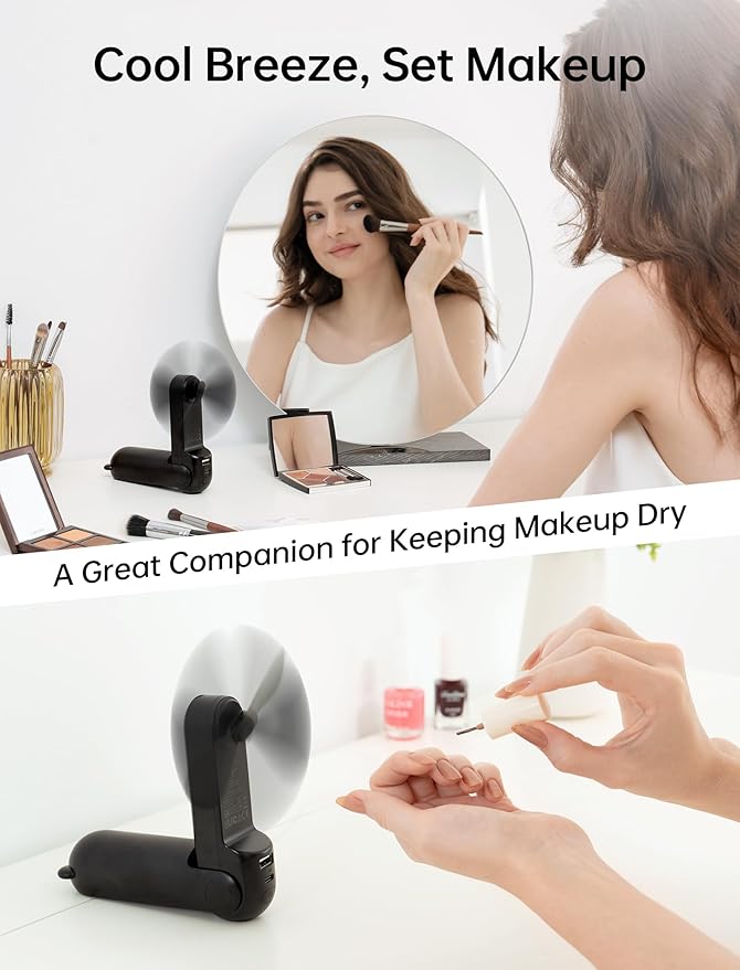 - Foldable Design and Mini Size: The folding design makes it easy to be carried and stored. Besides, with the capsule shape(5.1*1.65*1.65 inch, weight: 6.38 OZ), this rechargeable fan can hide the fan blade, small and easy to slide into your pocket and purse.Gifts choice for Christmas & New Year