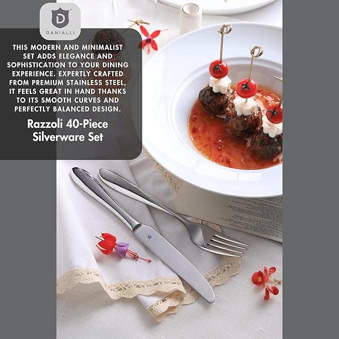 Modern Silverware Set, 18/10 Stainless Steel Flatware, Mirror Finish, Dishwasher Safe, Elegant Cutlery for Home and Dining, Built to Last (40-Piece, Razzoli)