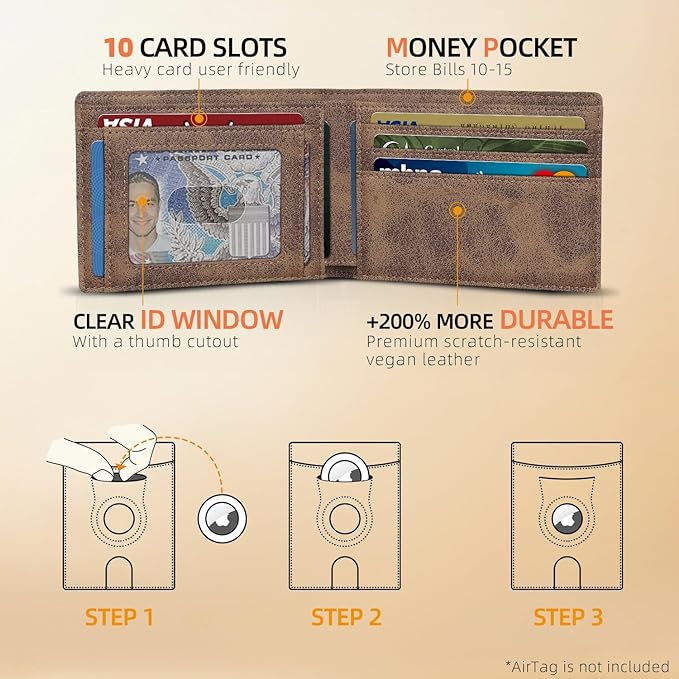 - NO MONEY CLIP DESIGN - Measuring 4" x 3.5", this slim men's wallet boasts a bill compartment that occupies less space than a metal money clip, effectively reducing bulk. It includes 11 card slots, featuring a quick-access slot on the front, 10 slots on the wallet sleeves, and 1 integrated AirTag pocket. (AirTag is not included)