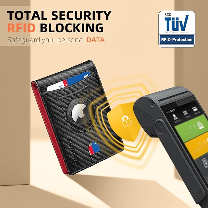 - RFID ANTI-THEFT FUNCTION - This wallet for AirTag boasts RFID blocking shield technology, safeguarding your personal and financial data against unauthorized scanning and identity theft. Enjoy peace of mind knowing that your information is safe and secure