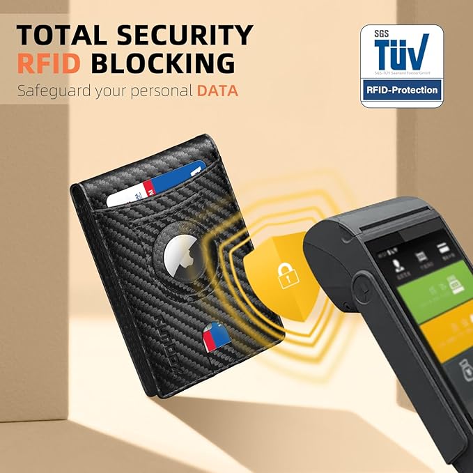 - RFID ANTI-THEFT FUNCTION - This wallet for AirTag boasts RFID blocking shield technology, safeguarding your personal and financial data against unauthorized scanning and identity theft. Enjoy peace of mind knowing that your information is safe and secure