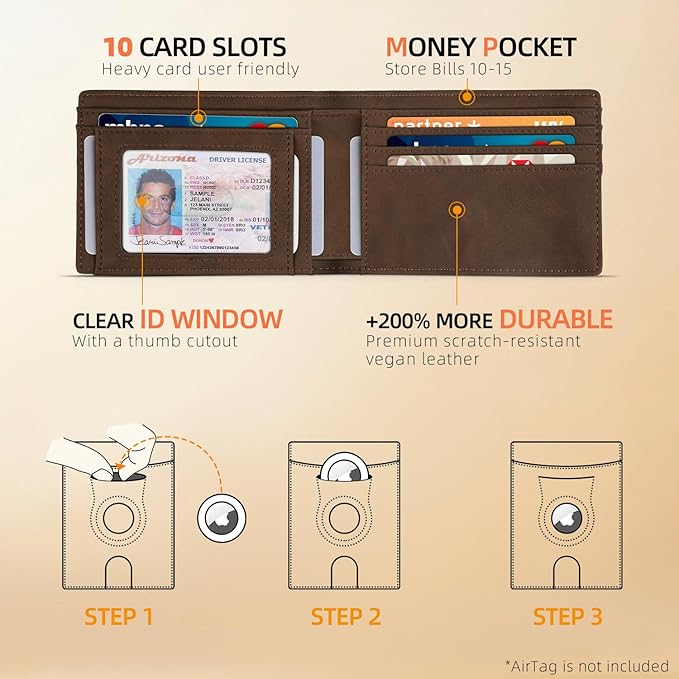 - NO MONEY CLIP DESIGN - Measuring 4" x 3.5", this slim men's wallet boasts a bill compartment that occupies less space than a metal money clip, effectively reducing bulk. It includes 11 card slots, featuring a quick-access slot on the front, 10 slots on the wallet sleeves, and 1 integrated AirTag pocket. (AirTag is not included)