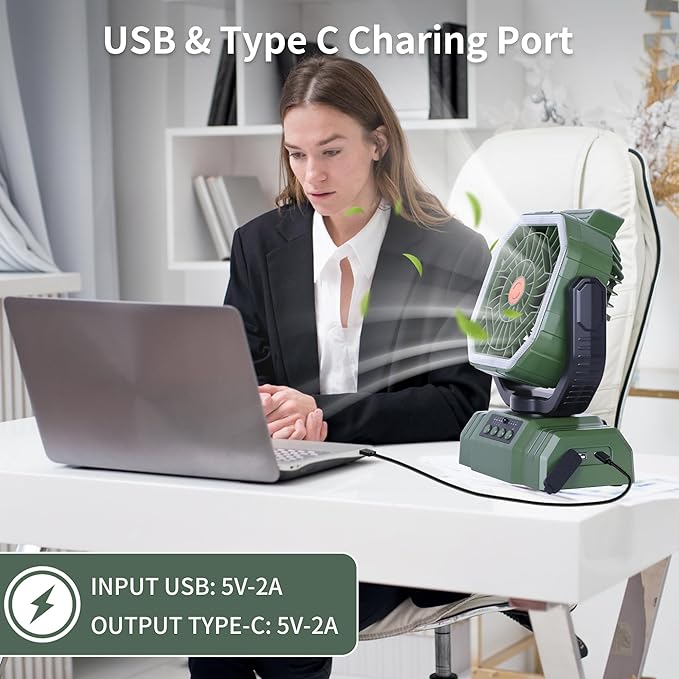 - Whisper quiet & powerful airflow - Equipped with the latest brushless motor technology and ultra-thin fan blades, this portable fan rechargeable operates quietly at less than 28 dB while delivering powerful airflow. With 4 wind speed options, you can adjust the airflow in your tent for optimal comfort. The tent fan also features 3 brightness levels for the integrated LED light, making the fan suitable for bedroom, travel, camping