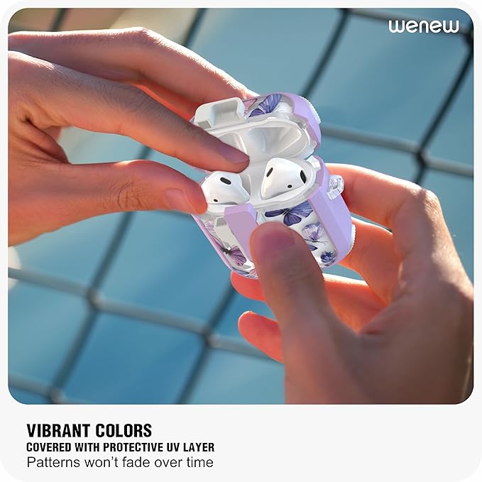 WENEW Case for AirPods 1 & 2 Case Cover Secure Lock Automatic Snap Switch Clip Cleaner Kit Lanyard Women Stylish Flower Armor Hard Shell (Butterfly, AirPods 1st & 2nd)