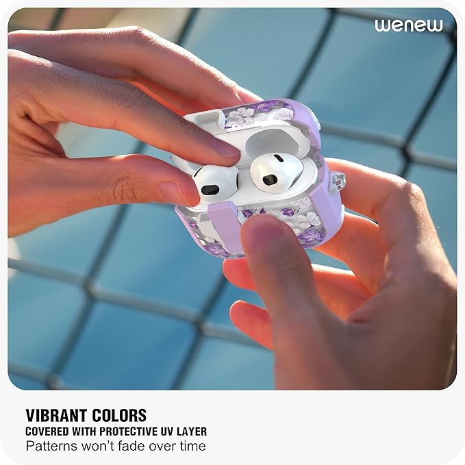 WENEW Case for AirPods 3 Case Cover Secure Lock Automatic Snap Switch Clip Cleaner Kit Lanyard Women Stylish Flower Armour Hard Shell Full Body Front LED Visible (Purple Flower, AirPods 3rd)