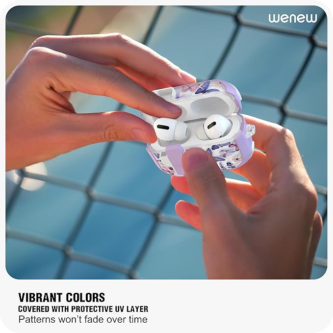 WENEW Case for AirPods Pro & Pro 2 Case Cover Secure Lock Automatic Snap Switch Clip Cleaner Kit Lanyard Women Stylish Hard Shell Full Body Front LED Visible (Purple Butterfly, AirPods Pro & Pro 2)