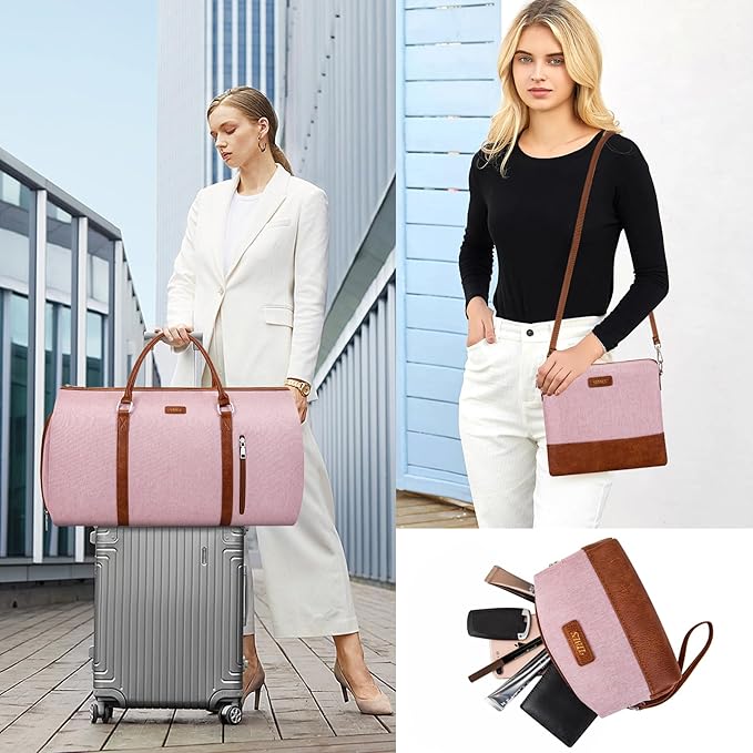 - Garment Duffel Bag with Suitcase Trolley Sleeve: Travel with effortless mobility. The suitcase trolley sleeve seamlessly slides over luggage handles, freeing your hands. Convert between a comfortable shoulder carry and a sleek suitcase-mounted mode in seconds with two adjustable, detachable straps (25"-49" length). Everything is designed for smooth transitions between airport, car, and hotel.