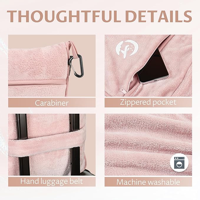 - ✈Smart & Convenient Design: Features a secure lock mechanism to attach the blanket to your luggage handle or backpack strap, freeing your hands while traveling. The spacious zippered pocket stores travel essentials like your phone, passport, or travel pillow. This travel pillow and blanket set offers ultimate convenience for frequent flyers and kids airplane essentials.