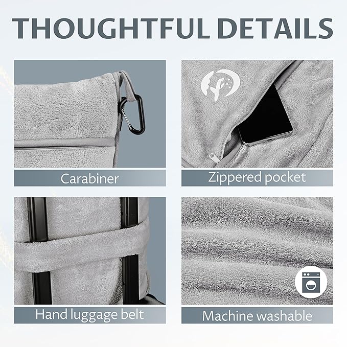 - ✈Smart & Convenient Design: Features a secure lock mechanism to attach the blanket to your luggage handle or backpack strap, freeing your hands while traveling. The spacious zippered pocket stores travel essentials like your phone, passport, or travel pillow. This travel pillow and blanket set offers ultimate convenience for frequent flyers and kids airplane essentials.
