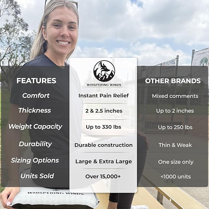 Whispering Winds Inflatable Seat Cushion - Comfortable Blow-up Foam Pad for Airplane, Travel, Stadium, Outdoors, Camping, Car & More