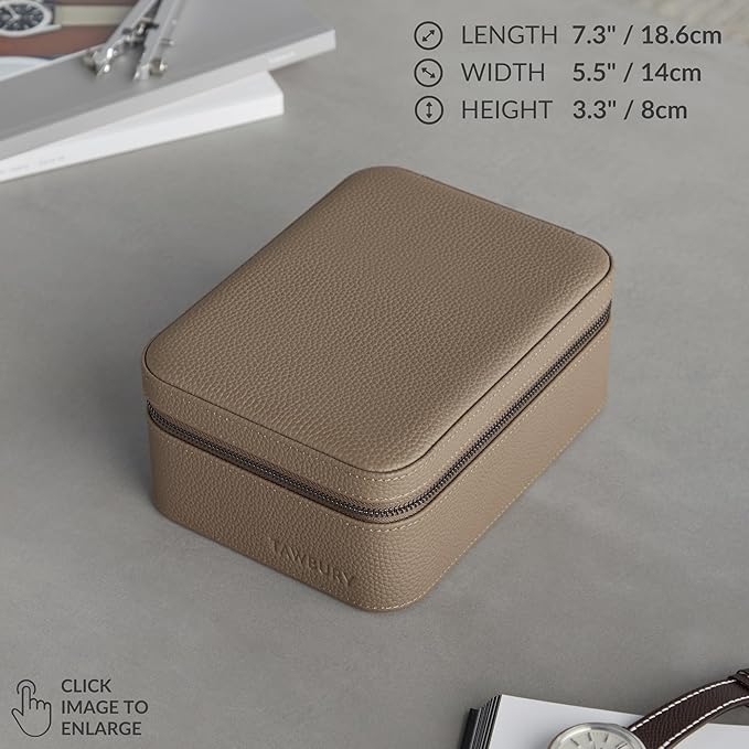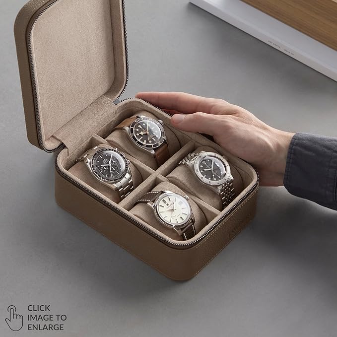 TAWBURY Watch Case - 4 Slot Genuine Top-Grain Leather Watch Box for Men & Women with Extra Wide Pillows for Large Watches - Portable Wristwatch Storage for Home & Travel (Taupe)