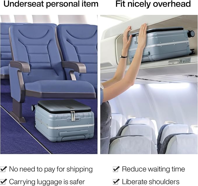 - 【Underseat carry on luggage】The size of the 16 inch aluminum frame carry on luggage airline approved:overall dimensions is L14*W9*H17.9"(include handles and wheels),packing dimensions is L13.5*W15.1*D7.8,capacity≈26.2L,weight 6.4LB.Can fit under the seat and fit in the overhead bin,It can also be used as a personal item,it's a best lightweight luggage
