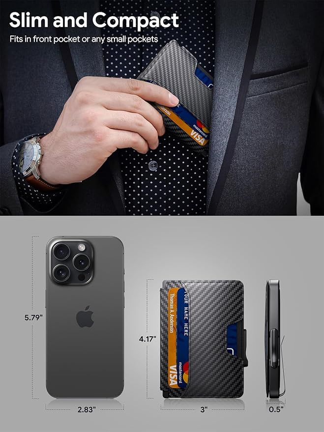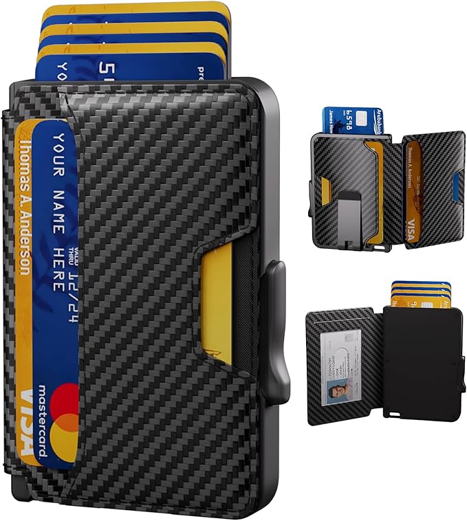 - Modern Design & Sturdy Construction: This minimalist wallet for men features the latest combination of a waterproof carbon fiber leather cover and a aluminum card case. Compared to traditional leather wallets, the slim wallet for men is more compact and sleeker, convenient carrying in front pocket, and the aluminum alloy body makes it more durable.