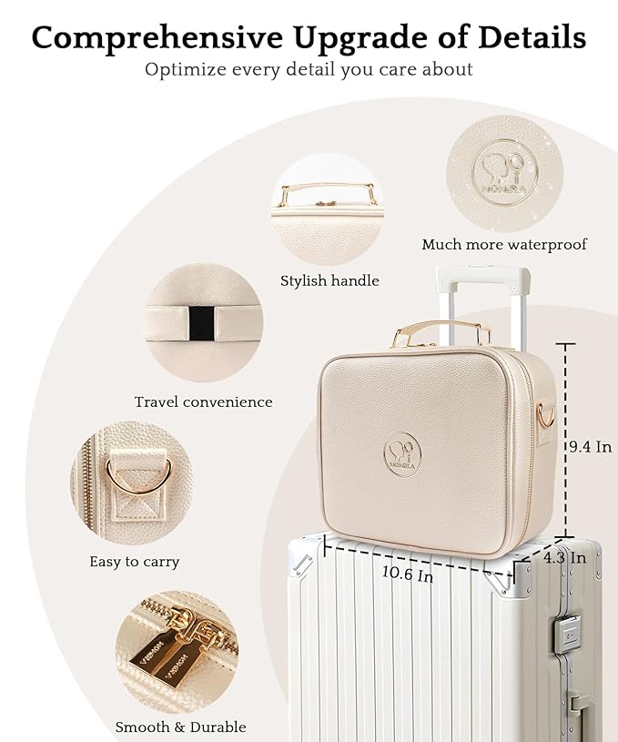 - 👍🏻【Upgraded Quality Materials】Experience the difference with our upgraded cosmetic bag,keeps the makeup organize bag looking as new as possible for a longer period! The outer layer is now woven with waterproof synthetic leather, while the inner protective cover features shock-absorbing EPE pearl cotton and dust-resistant fibers. The zipper and ergonomic circular handle design ensure convenience and longevity, making it the ultimate travel companion for your cosmetics.