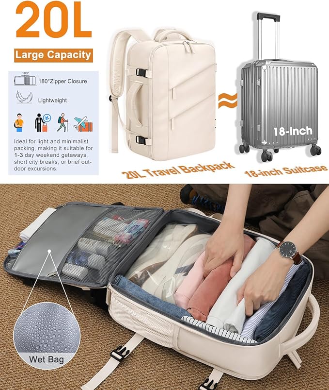 - 20L Capacity & 11 Pockets to Keep Organized:Roomy main compartments with 180° opening zipper allow access from the top like a traditional backpack or fully open like a suitcase. Say goodbye to mess and now every item has its place.2 front pockets for easy access to travel essentials, while a dedicated wet/dry bag separates toiletries. 1 zipper mesh pocket provides visual storage, Padded laptop compartment with 1 organizer pocket is nice for small items, keeping everything neat and within reach.
