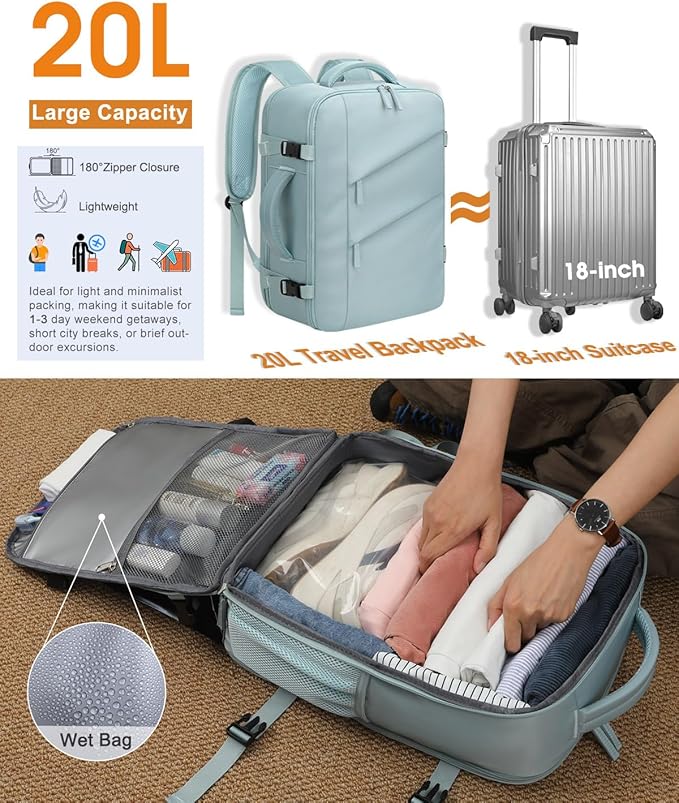 - 20L Capacity & 11 Pockets to Keep Organized:Roomy main compartments with 180° opening zipper allow access from the top like a traditional backpack or fully open like a suitcase. Say goodbye to mess and now every item has its place.2 front pockets for easy access to travel essentials, while a dedicated wet/dry bag separates toiletries. 1 zipper mesh pocket provides visual storage, Padded laptop compartment with 1 organizer pocket is nice for small items, keeping everything neat and within reach.