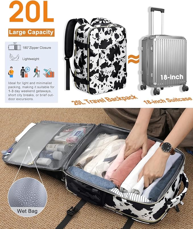 - 20L Capacity & 11 Pockets to Keep Organized:Roomy main compartments with 180° opening zipper allow access from the top like a traditional backpack or fully open like a suitcase. Say goodbye to mess and now every item has its place.2 front pockets for easy access to travel essentials, while a dedicated wet/dry bag separates toiletries. 1 zipper mesh pocket provides visual storage, Padded laptop compartment with 1 organizer pocket is nice for small items, keeping everything neat and within reach.