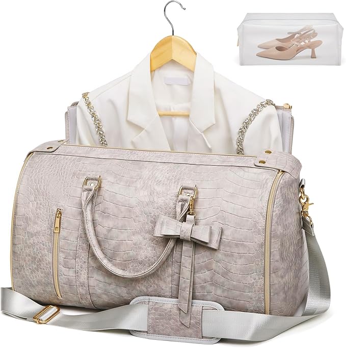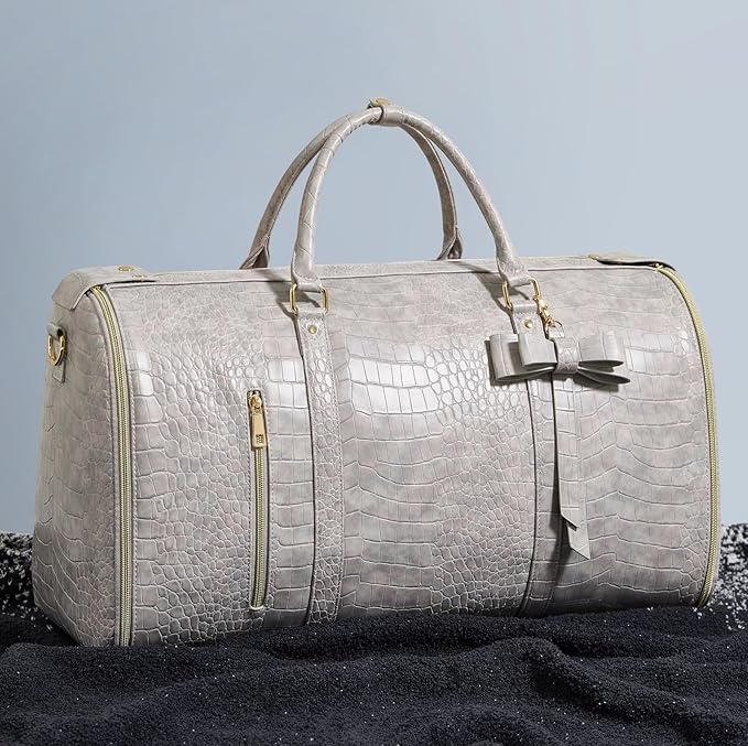 - A Garment Bag With Multi-Funtion: Combined with fancy way, this garment bags for travel is made of PU leather. It is not only a convertible carryon but a wedding dress bag. A detachable bownot was designed to make it fit different style. On the front of suit bag was set a pocket for putting in your passport and phone. Heading for honey moon trip, destination wedding, weekend getaway, or business trip? Don't miss it