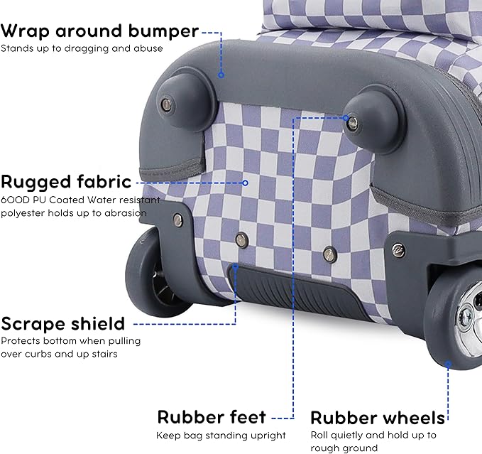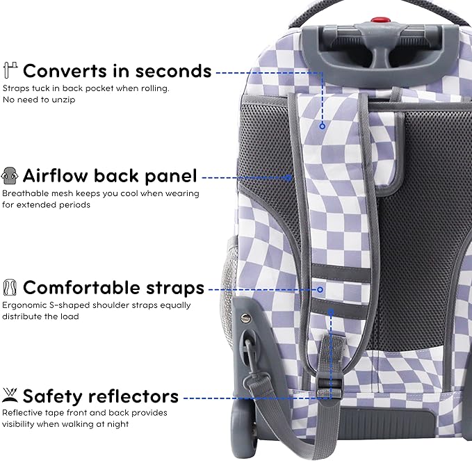 - Large Backpack With Wheels — This 20” rolling backpack for boys and girls offers the load carrying ability of a kids rolling suitcase and the portability of a school bookbag. For kids and adults who carry a lot of stuff