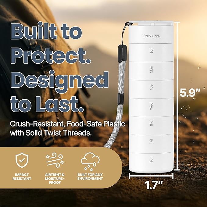 - Built for Real Life: Travel with confidence. Weekly pill organizer food-safe, crush-resistant plastic wonโt crack or leak, even in packed bags or rugged trips.