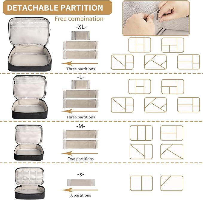 - Double Layer Design: All three size: X-large, Large and Medium are double layer, and the Small size is one layer. The first layer is designed with Elastic loops and mesh pockets to keep all your small travel things in one place. The second layer has adjustable padded dividers to meet your various needs