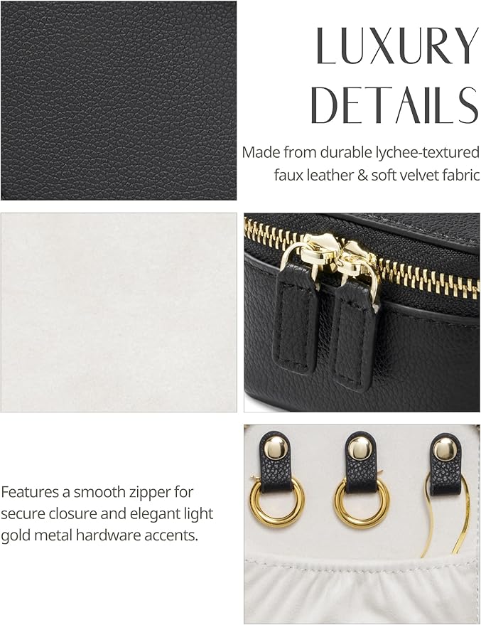 - Made from durable lychee-textured faux leather, the small jewelry box features a smooth zipper for secure closure and elegant light gold metal hardware accents, adding a touch of luxury and sophistication to the design.