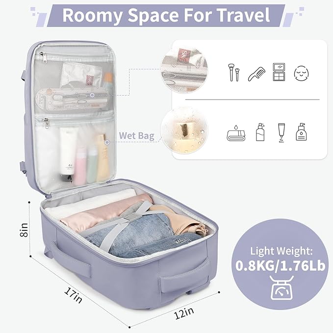 - Flight Approved Carry on Backpack: The TSA backpack for travel measures 17*12*8 inches and weighs 0.8 kg(1.76 lbs). This travel backpack for women men traveling features a 180 degree zipper closure to help you pass through security check quickly, compliant with airline carry-on requirements. Can be a personal item travel bag fits overhead bin or under the seat and save on paying any extra baggage fees