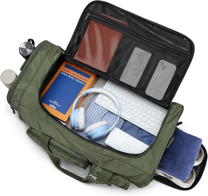 - 【Multifunctional Pockets & Design】Our duffle bag backpack has a total of 11 pockets. Includes 1 large internal mesh pocket and 2 internal zipper pockets; Outside: 2 front zip pockets, 1 flap pocket, 1 side zip pocket and 2 mesh water bottle pockets, 1 shoes compartment, 1 trolley luggage sleeve. The bottom zip pocket hides the backpack straps when not in use. And the elastic cord on top provides additional storage space for jackets or towels.
