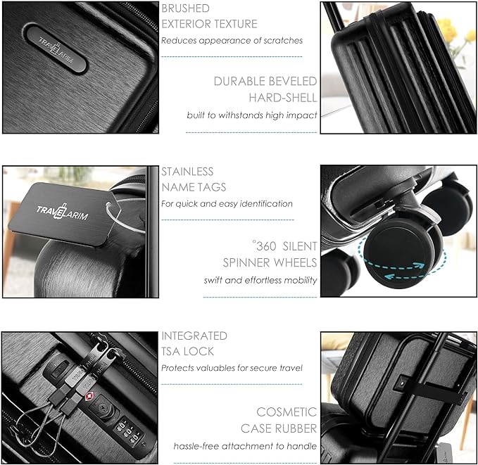 - Hard Shell Carry On Luggage Set: The impact-resistant design of our luggage carry on suitcase and cosmetic case include beveled sides to deflect hard knocks and a brushed finish that reduces scratches. Enjoy hassle-free travel with carry-on luggage that works for you.