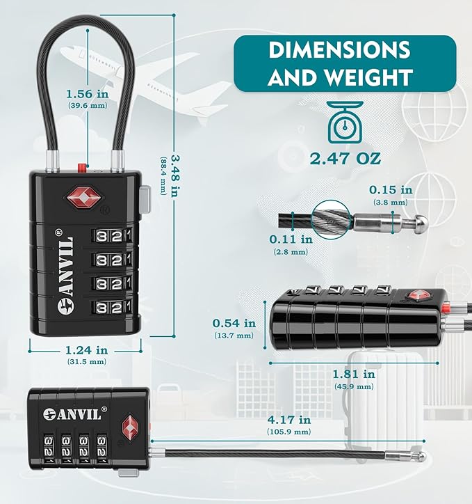 - ★ Easy-to-Set Personal Combination: The ANVIL Luggage Lock is designed for ease of use, featuring an easy-to-read dial for quick and accurate combination setup. As one of the top TSA-approved suitcase locks, it ensures no errors while setting your personal code.