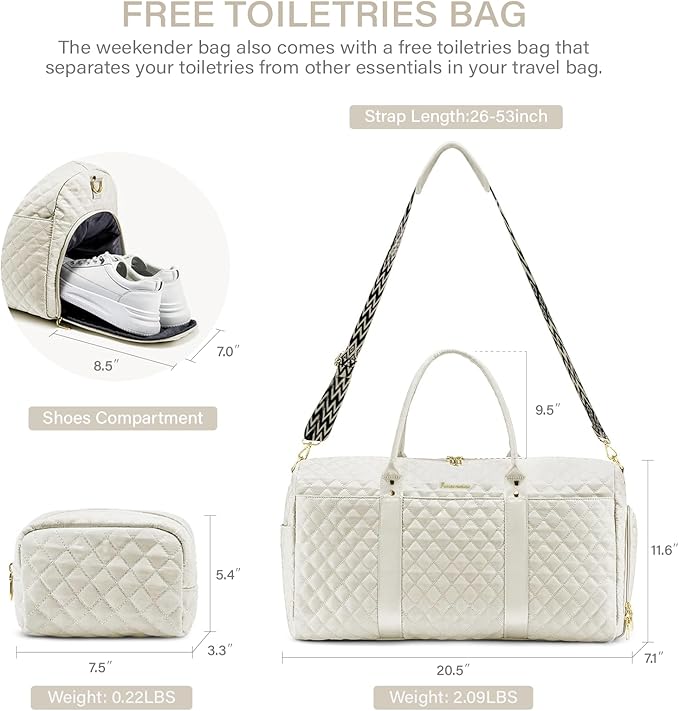 - 【Shoe Compartment & Free Separate Toiletry Bag】Separate flat bottom compartment of this duffle bag women can hold your shoes or dirty clothes for easy separation from clean clothes when traveling.Keeps you organized and takes the hassle out of packing. If you're a novice mother, the bottom part is also perfect for storing diapers, wipes, diaper bag items.The weekender bag also comes with a free toiletries bag that separates your toiletries from other essentials in your travel bag.