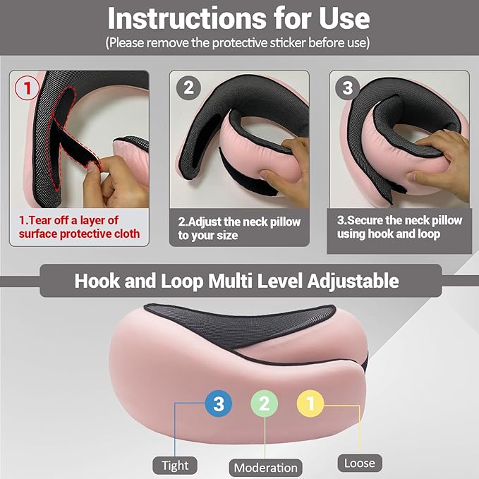 - 【Hook and Loop Fasteners Design】: NOTICE: Please remove the protective cloth on the Vel-cro before use. Our neck pillow has a layer of anti-stick cloth to prevent other things from sticking to it when not in use. After tearing off, it can stick firmly. We specially designed long side Vel-cro can meet different neck size requirements. You can adjust the tightness of this, that makes you feel relaxed.
