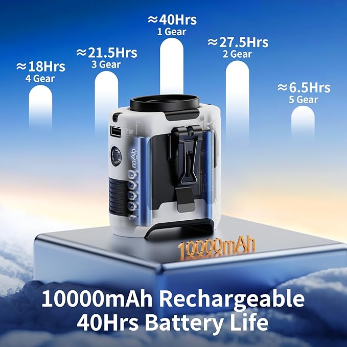 - 【Long Lasting Working Time】Built-in 10000mAh rechargeable battery, which can be run continuously for up to 40 hours at low speed according to the air speed and light mode, and takes 4-5 hours to to fully charge. Our portable waist clip fan can be used when it's during charging. Built-in 5V-3A type C input and 5V-2A USB output, Which is convenient for charging the cordless fan, and it provides long-lasting cooling wherever you need it