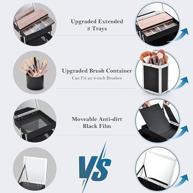 - Upgraded 3 Trays: The improved 3-tier trays hold longer eyeshadow palettes and tools, offering extra storage for neater cosmetics. Ideal for personal or professional use, it enhances convenience and efficiency. The extended design adds space and elegance, elevating the makeup experience. Perfect for organizing cosmetics, it's a top pick for any makeup table.