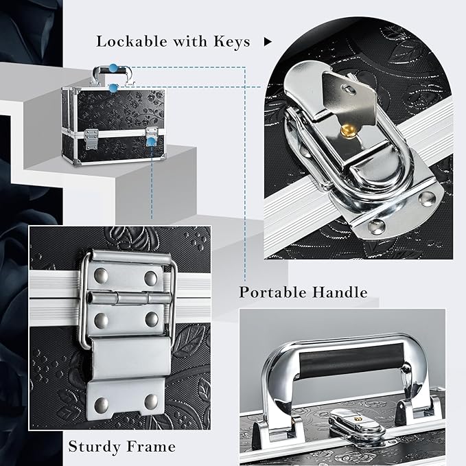 FRENESSA Makeup Train Case Makeup Box 11.8 Inch Large Makeup Case Organizer 3 Trays with Mirror Locking Cosmetic Storage Box for Cosmetics Nail Supplies Sewing Travel Case Black Floral