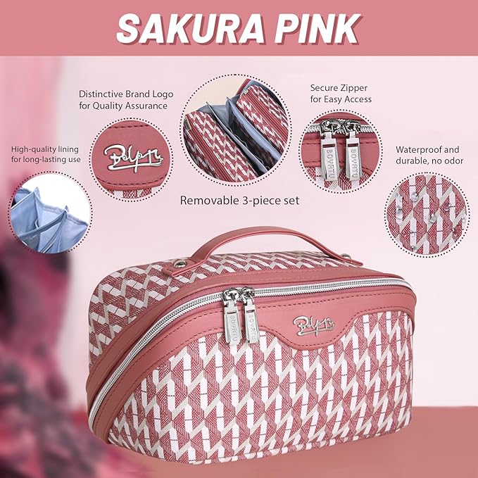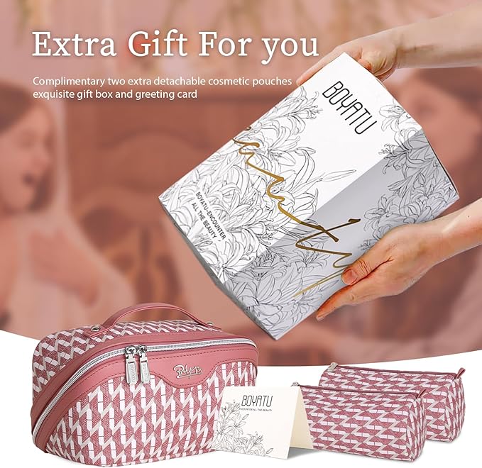 - Travel Makeup Bag Set of 3: This BOYATU travel makeup bag with five compartments comes with two small makeup pouches, ensuring optimal organization for your skincare products and cosmetics. Nice for your travel, business trips, vacations, outdoor activities and picnics.