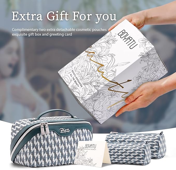 - Travel Makeup Bag Set of 3: This BOYATU travel makeup bag with five compartments comes with two small makeup pouches, ensuring optimal organization for your skincare products and cosmetics. Nice for your travel, business trips, vacations, outdoor activities and picnics.