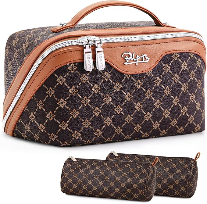 BOYATU Travel Makeup Bag Cosmetic Bags for Women: 3 Pcs Set Large Portable Make up Bag with Handle - Vegan Leather Toiletry Bags with Compartments - Makeup Organizer for Travel Essentials(A-1-Coffee)