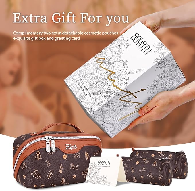 - Exquisite packaging: This travel make up bags for women comes beautifully packaged in an exquisite gift box, with a thoughtfully designed greeting card. It will be a great gift for ladies on Valentine's Day, Mother's Day, Birthdays, Christmas,Thanksgiving Day, Anniversary Day and more.