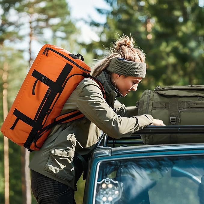 - Water Repellent Duffel ---- Built from heavy-duty water resistant tarpaulin and reinforced double layered tear-resistant floor panel, designed for harsh environments and features huge capacity to hold your workout gear or your trip stuffs. Best for hiking, camping, climbing, gym sports, car trip, traveling or other outdoor adventures