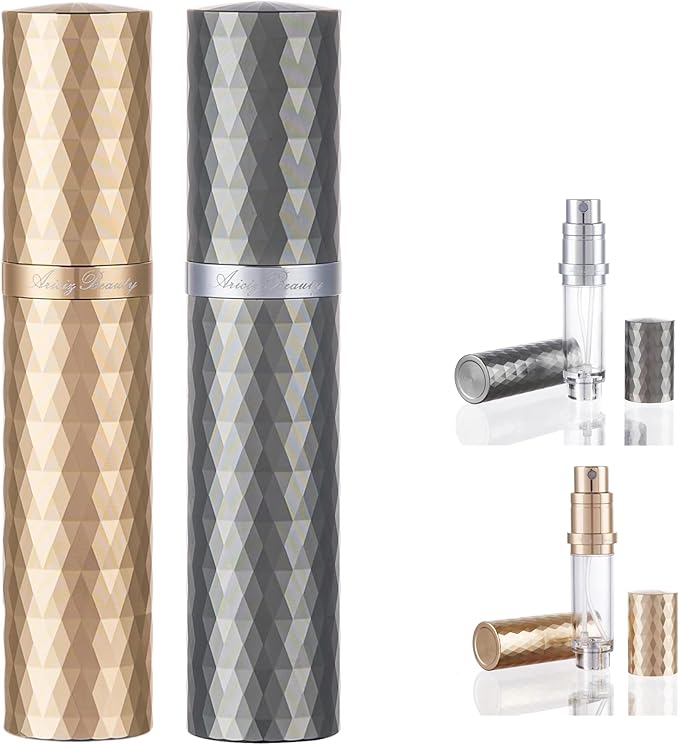 Travel Refillable Perfume Atomizer 0.17fl.oz/5ml. Cologne Pocket Recyclable Portable Sprayer Bottle. Mini Scent Pump Case Dispenser Perfume Container (GREY+GLOD)