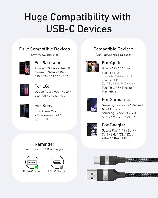 - Compatible Devices : Compatible Devices (Limited Charging Speeds): iPhone 16 / 16 Pro / 16 Plus / 16 Pro Max / 15 / 15 Pro / 15 Plus / 15 Pro Max Samsung Galaxy Note20 Ultra / Note20 / Note10+ / Note10 Samsung Galaxy S24 Ultra / S24+ / S24 / S23+ / S22+ / S23 Ultra / S22 Ultra / S23 / S22 / S21 / S21+ / S20 iPad Pro 12.9" (5th / 4th / 3rd Generation) / 11" (4th / 3rd / 2nd / 1st Generation) Google Pixel 3 / 4 / 5 / 6 / 7 / 8 / 3XL / 4XL / 5XL / 6 Pro / 7 Pro / 8 Pro, Fully Compatible Devices (5V⎓3A, QC 18W Max): Samsung Galaxy Note9 / 8 Samsung Galaxy S10+ / S10 / S9+ / S9 / S8+ / S8 LG V60 / V40 / V30+ / V30 / V20 / G8 / G7 / G6 / G5 Sony Xperia XZ2 / XZ2 Premium / X3 / Xperia 5 II Compatible Devices (Limited Charging Speeds): iPhone 16 / 16 Pro / 16 Plus / 16 Pro Max / 15 / 15 Pro / 15 Plus / 15 Pro Max Samsung Galaxy Note20 Ultra / Note20 / Note10+ / Note10 S… See more