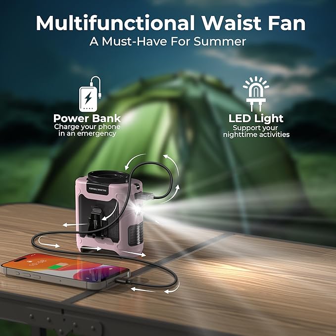 - 5-in-1 Multi-functional Waist Clip Fan: This portable fan not only functions as waist fan, neck fan, and desktop fan, but also features LED & SOS lights and a power bank. The built-in LED and SOS functions provide assistance for nighttime outdoor activities. It can also be used as an emergency power source to charge your phone without worry