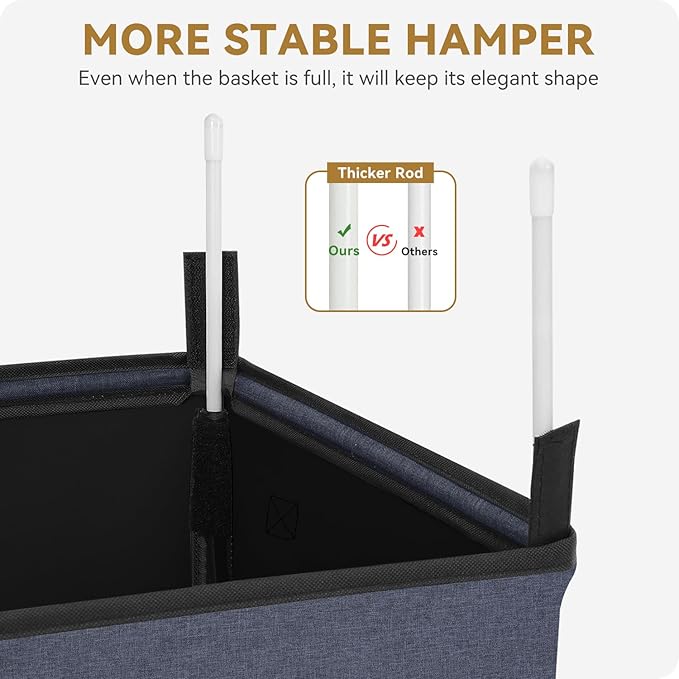 - 【Sturdy Structureand Not Deformed】 The 4 insert rods of the hamper is thicker and stronger, and the MDF panel is added at the bottom, a metal frame is embedded in the top to form a solid structure of the clothes basket. It will not collapse or deform after long-term use and remains rigid even when the hamper basket is filled.