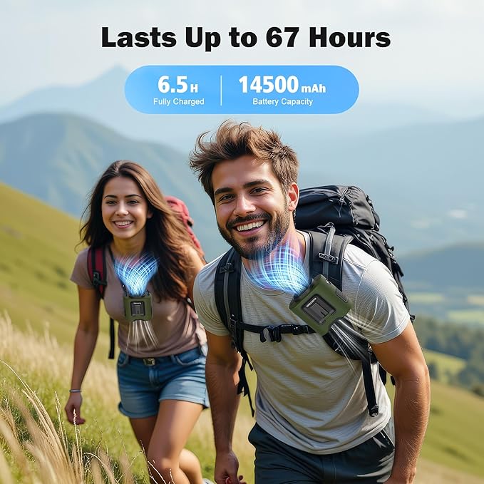 - 【14500mAh Enduring Working Time】Equipped with a 14500mAh rechargeable battery, a 6.5-hour charge provides up to 67 hours of continuous operation on the lowest speed. Enjoy uninterrupted cooling even while charging, making it an essential gadget for summer