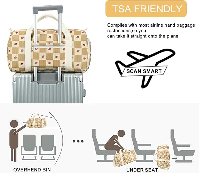 - The spacious main compartment of the cute girl weekend bag can accommodate sports jackets, pants, shirts, hats and thermos cups. The zippered sacks in the main compartment can hold important small items such as cards