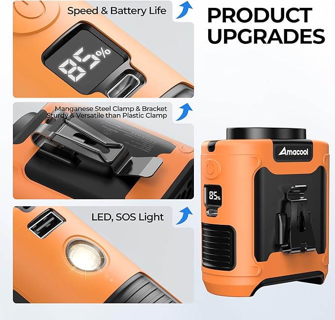 - 40H Max Running: AMACOOL waist clip fan is designed with buyer's needs in mind, providing up to 40 hrs of continuous airflow at wind speed 1 with the 10000mAh built in battery, it lasts up to 8 hrs even in the strongest speed, greatly reduces the number of recharges, LED display let you know when to charge; Feature with a 5V-2A USB output port to charge your phone in emergency