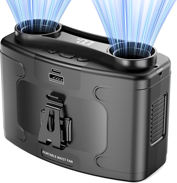 - Emergency Power Source: Features a Type-C input/output and USB output (5V/3A) of this portable belt fan, free charge your phone, tablet, or other devices on the go. Ensures that you can stay cool and keep in touch with loved ones in power outages or emergencies