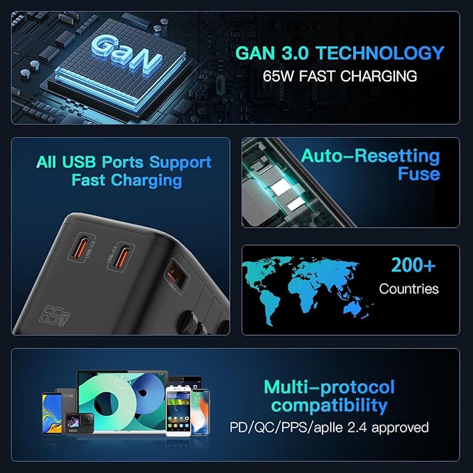 - TRAVEL CHARGER FOR MULTIPLE DEVICES: HAPOW travel adapter with 1 universal AC port, 3 USB-C ports(GaN PD 65W), 1 USB-A ports(QC 45W). Thanks to the advanced GaN 3.0 technology, it has a better charging performance of up to 65W and generates less heat