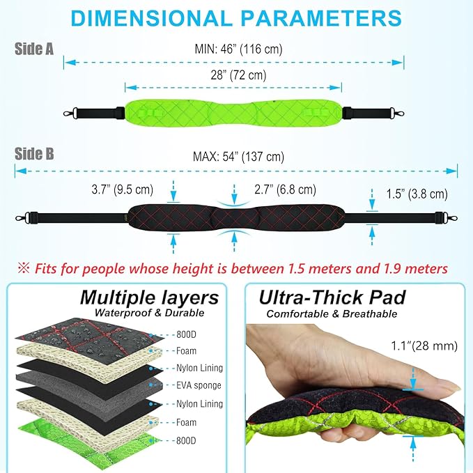 - Material and Size: The padded bag strap is made of high-density tear-resistant nylon and jacquard quilted design; Adjustable length from 45" to 54", the pad width of 3.8" and length of 28". Swivel hooks are enough for the weight of 30kg